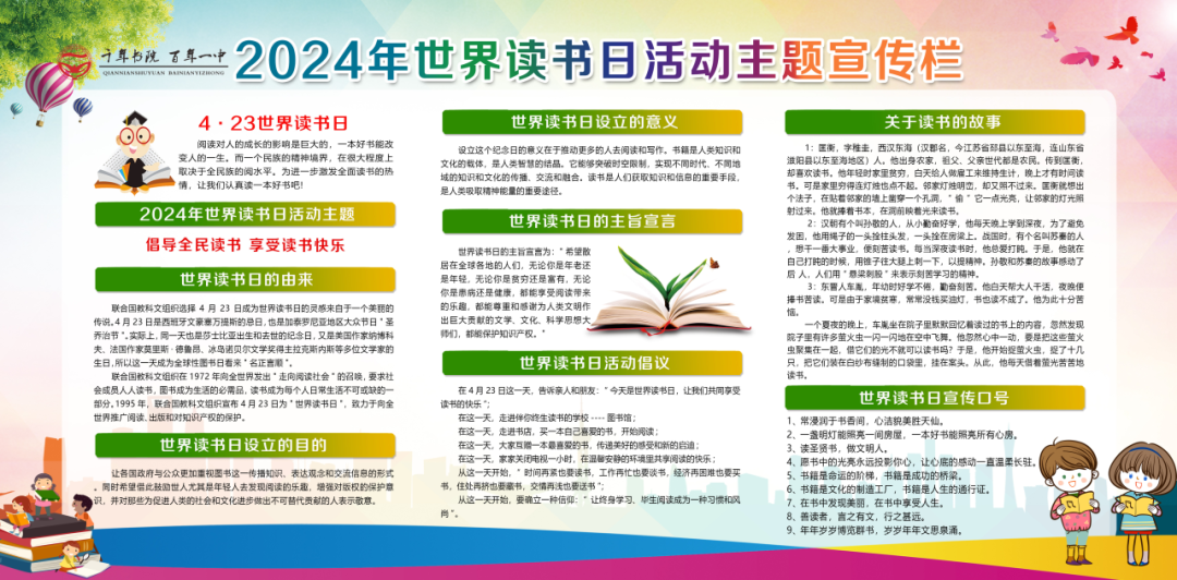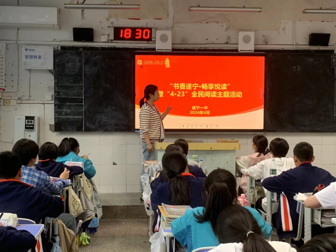 書籍是人類知識(shí)的載體,是人類智慧的結(jié)晶,是人類進(jìn)步的階梯。讀書可以讓人保持思想活力,讓人得到智慧啟發(fā),讓人滋養(yǎng)浩然之氣。在第29個(gè)世界讀書日到來之際,為深入貫徹落實(shí)黨的二十大關(guān)于深化全民閱讀活動(dòng)的重要部署,遂寧一中德育處、團(tuán)委通過學(xué)校電子顯示屏、移動(dòng)展板營(yíng)造濃厚讀書日活動(dòng)氛圍,通過開展主題班會(huì)、主題演講等活動(dòng)讓學(xué)生愛上閱讀,讓讀書成為一種習(xí)慣。